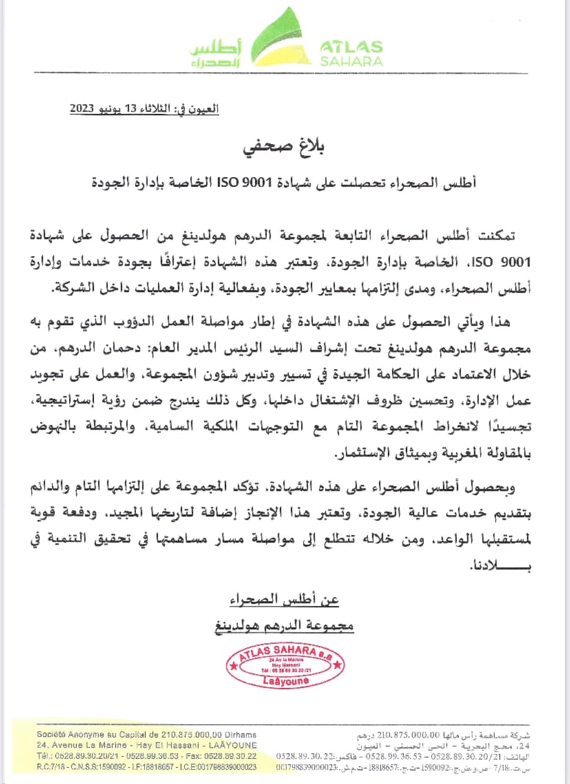 وبحصول أطلس الصحراء على هذه الشهادة، تؤكد المجموعة على إلتزامها التام والدائم بتقديم خدمات عالية الجودة، وتعتبر هذا الإنجاز إضافة لتاريخها المجيد، ودفعة قوية لمستقبلها الواعد، ومن خلاله تتطلع إلى مواصلة مسار مساهمتها في تحقيق التنمية في بــــــــــــــــــــــــــــــــــــــــلادنا.