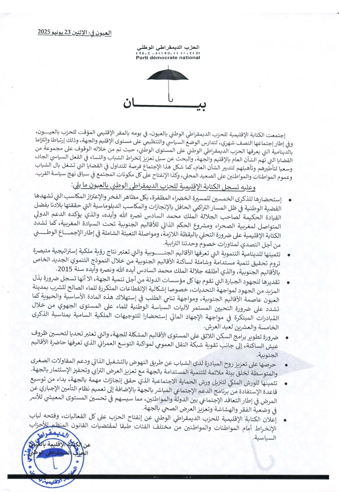 وعليه تسجل الكتابة الإقليمية للحزب الديمقراطي الوطني بالعيون ما يلي: