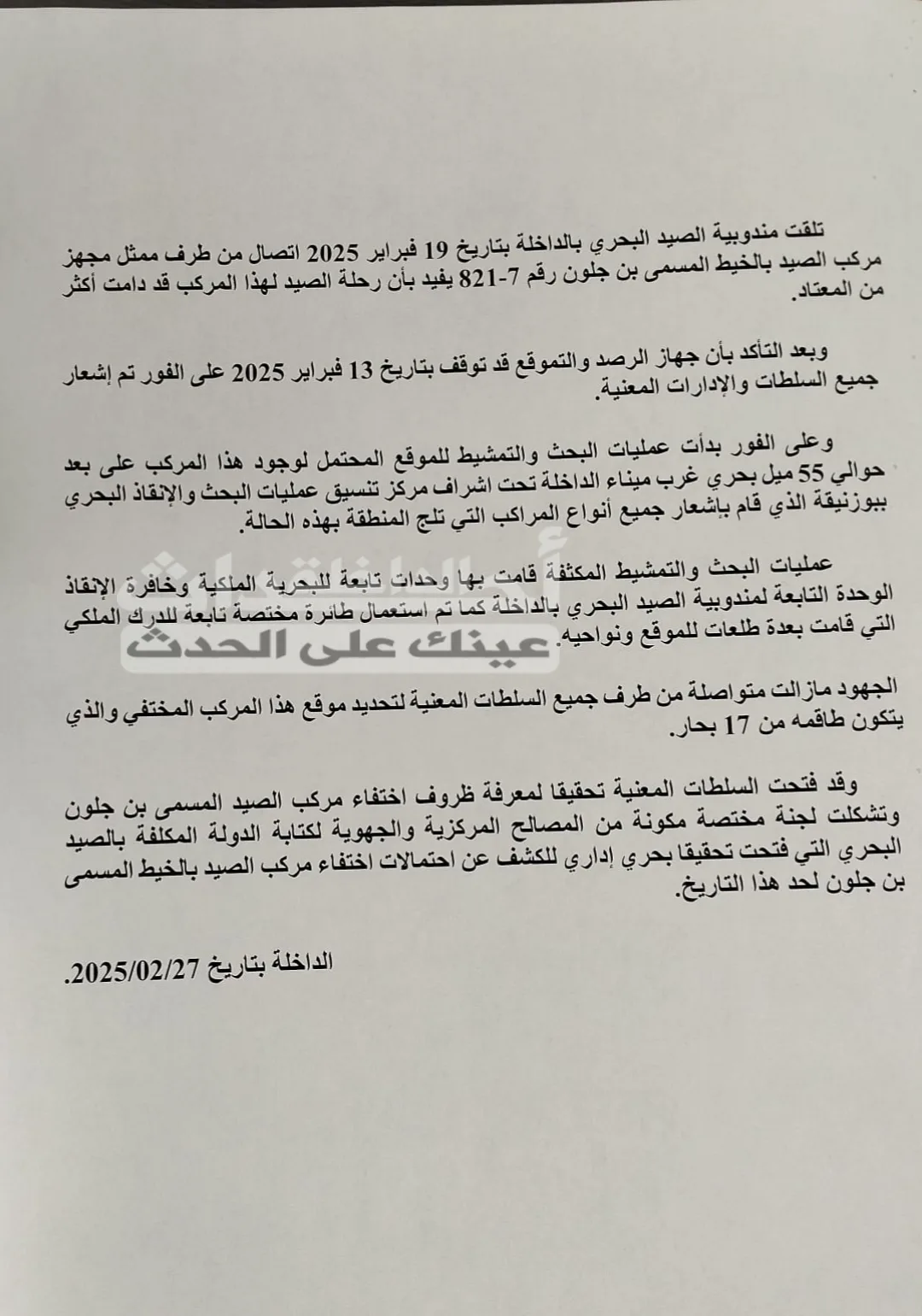 أحداث الداخلة|أحداث بحرية مندوبية الصيد البحري بالداخلة توضح تفاصيل وحيثيات غرق مركب “بنجلون” أحداث الداخلة الخميس 27 فبراير 2025 - 12:39