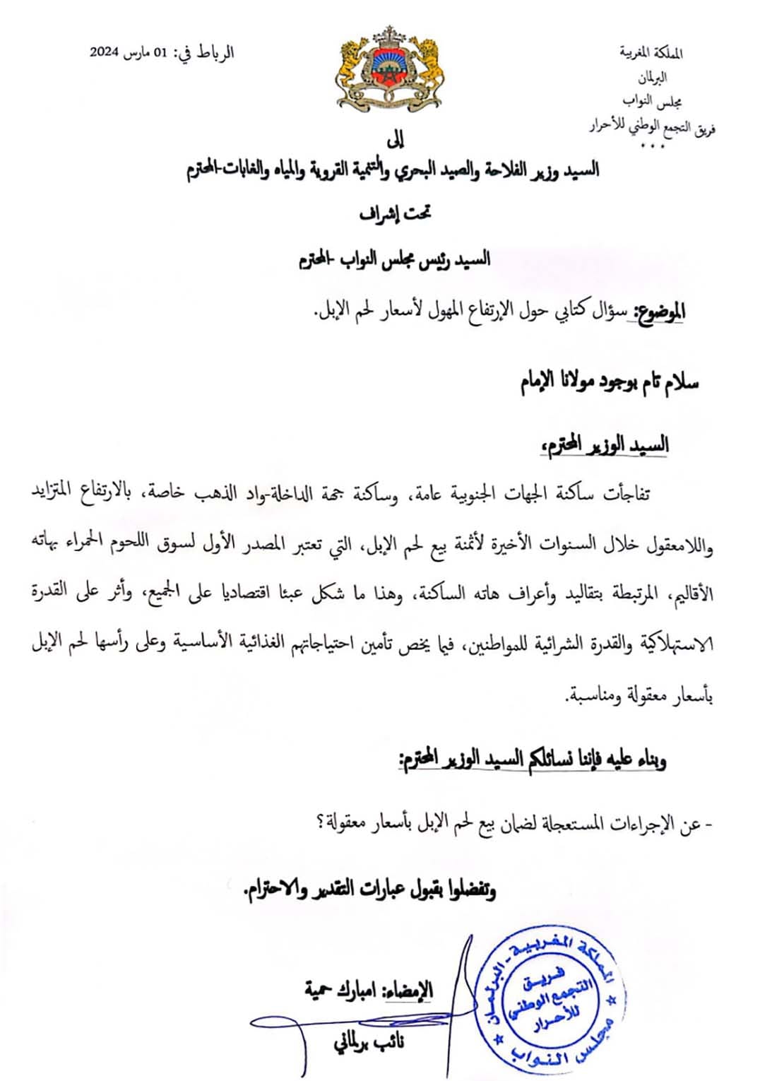 تقدم النائب البرلماني عن فريق التجمع الوطني للأحرار، مبارك حمية، بطرح سؤال كتابي موجه لوزير الفلاحة والصيد البحري والتنمية القروية والمياه والغابات، حول مشكلة أضحت تؤرق العديد من ساكنة مدينة الداخلة خاصة الفئات الهشة، وهي غلاء أسعار لحوم الإبل، هذه المادة الحيوية التي تعد أساسية في أطباق ساكنة المنطقة ولا يستغنى عنها البتة، يعتبر ارتفاع اسعارها بشكل غير منطقي عبئا على كاهل الفئات الضعيفة بالمدينة.