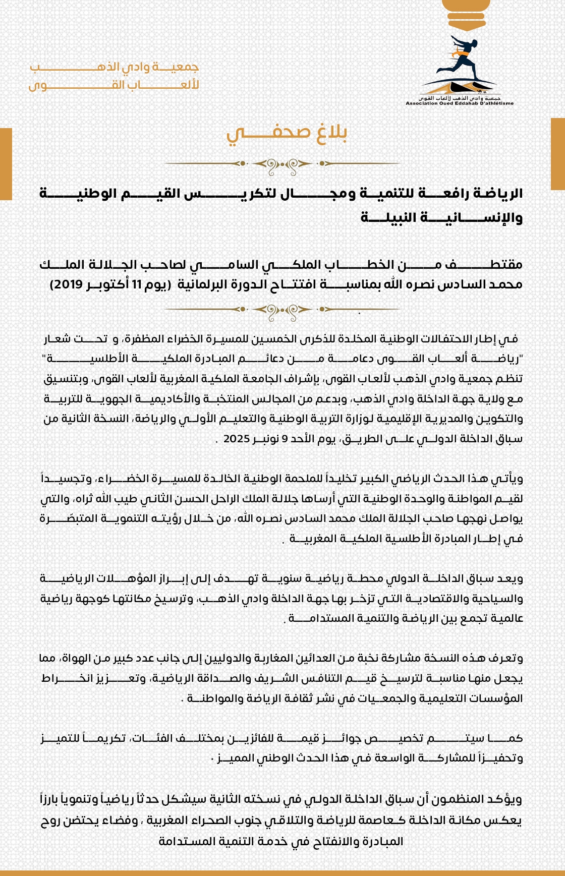 يأتي السباق، الذي يُنظم بتنسيق مع ولاية جهة الداخلة وادي الذهب وبدعم من المجالس المنتخبة والشركاء المحليين، كتجسيد لقيم المواطنة والوحدة الوطنية التي أرستها ملحمة المسيرة الخضراء، وتأكيدًا على النهج التنموي الذي يقوده صاحب الجلالة الملك محمد السادس، خاصة في إطار المبادرة الأطلسية الملكية.