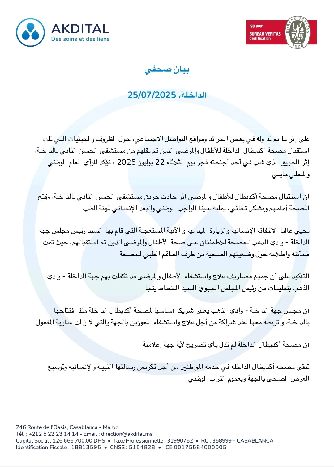 على إثر ما تم تداوله في بعض الجرائد ومواقع التواصل الاجتماعي، حول الظروف والحيثيات التي تلت استقبال مصحة أكديطال الداخلة الاطفال والمرضى الذين تم نقلهم من مستشفى الحسن الثاني بالداخلة، إثر الحريق الذي شب في أحد أجنحته فجر يوم الثلاثاء 22 يوليوز 2025 ، نؤكد للرأي العام الوطني والمحلي مايلي