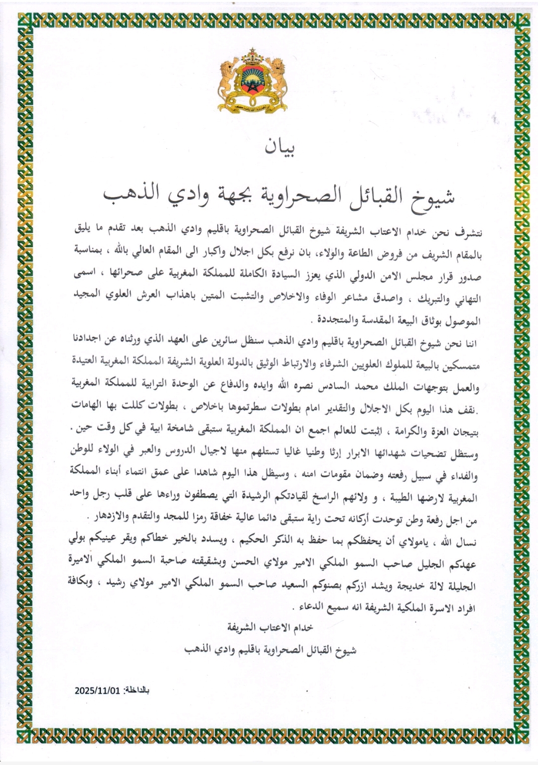 وجاء في البيان: “إننا نحن شيوخ القبائل الصحراوية بإقليم وادي الذهب سنظل سائرين على العهد الذي ورثناه عن أجدادنا، متمسكين بالبيعة للملوك العلويين الشرفاء والارتباط الوثيق بالدولة العلوية الشريفة”. وأضاف الشيوخ أنهم يقفون “بكل إجلال وتقدير” أمام البطولات التي سطرها أبناء الوطن، والتي أثبتت أن المملكة المغربية ستبقى “شامخة أبية في كل وقت وحين”.