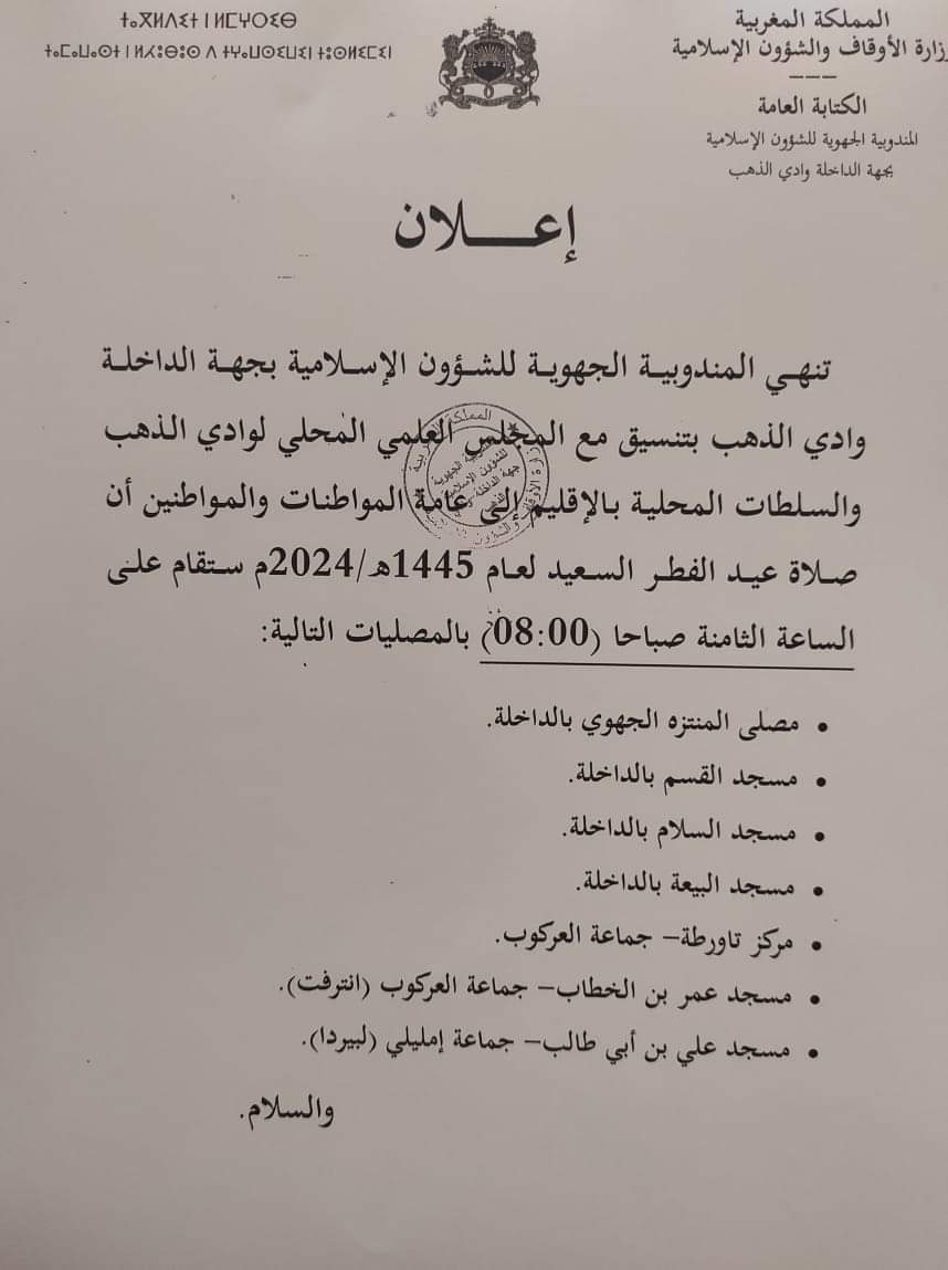 أحداث الداخلة|أخبار الداخلة هذه أماكن ومواقيت أداء صلاة عيد الفطر 2024 بمدينة الداخلة أحداث الداخلة الأحد 07 أبريل 2024 - 6:38