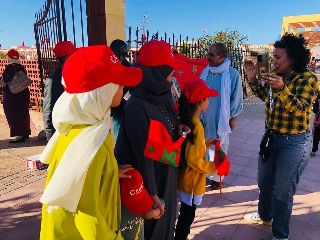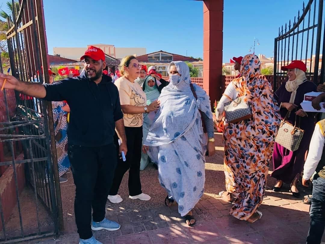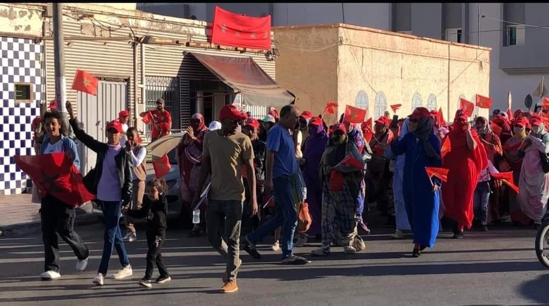 وتجمع الحشود بفضاء لذة الجنوب كنقطة انطلاق المسيرة إلى ساحة الحسن الثاني من أجل التعبير عن اللحمة القوية بين ساكنة الصحراء بأهداب العرش العلوي المجيد، و دعما لمبادرة الحكم الذاتي المغربية .